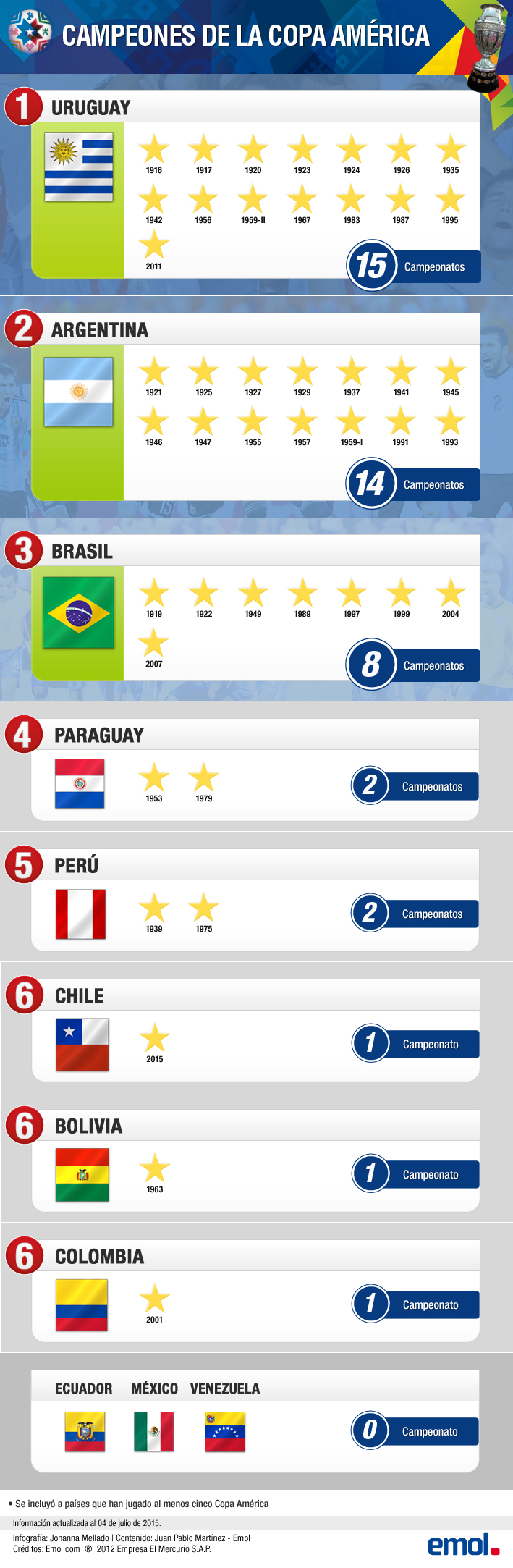 Copa America Ganadores Por Año / Champions League... Un Poco de Historia - Taringa!. A partir de 1993 se invita a participar del torneo a dos selecciones de fútbol que no. El antiguo sistema de todos contra todos utilizado previamente fue reemplazado por un sistema de tres grupos cuyos tres ganadores más el campeón vigente se. Argentina no gana una copa américa desde el año 1991, brasil siempre que organizó una copa, salió campeón. Lista de todos los campeones por año. Argentina es la nueva reina de américa y empata en el pódium a uruguay (15 títulos).